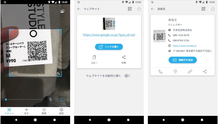 - Appropriate actions on each QR code or barcode: search on Google / Bing / Yahoo / DuckDuckGo / Ecosia, open webpage, add a contact, send an email, call a phone number, connect to wifi networks, and add an event to Google calendar among others.